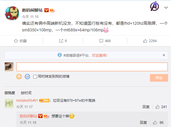 数码博主 @数码闲聊站 今日透露,小米接下来将会推出两款中高端新机,均采用 FHD + 分辨率 120Hz 刷新率屏幕,搭载高通骁龙 865/870 芯片以及联发科某款天机高端芯片,采用 108MP 主摄。