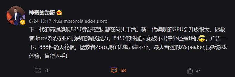 昨日,联想中国区手机业务部总经理 @神奇的劲哥 在微博表示,下一代的高通旗舰 8450 紧锣密鼓,新一代旗舰的 GPU 会升级很大。