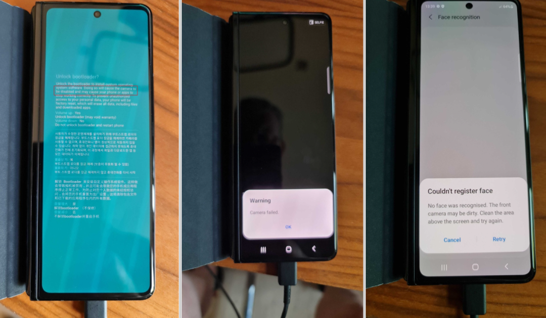 据外媒测试,解锁 BootLoader 后,该机的面部识别、相机,乃至第三方 App 的镜头调用都无法使用了,重新锁定 BootLoader 后,相机就能恢复正常工作。