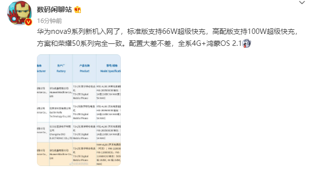 今天,有数码博主爆料,华为 nova 9 系列新机入网信息流出,该手机全系支持 4G网络,并搭载鸿蒙 HarmonyOS 2.1 系统。