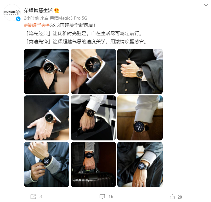 今日,荣耀官方曝光了荣耀手表 GS 3 的实拍图,包括流光经典与竞速先锋等版本。