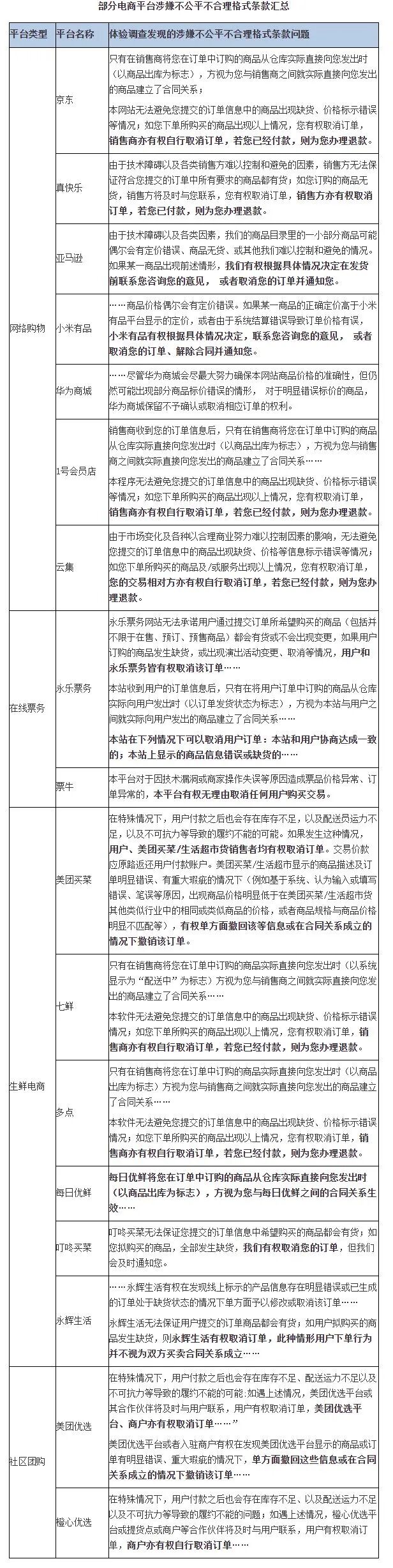 在本次体验调查中,有个别电商平台涉嫌存在不公平或不合理格式条款。这些电商平台涉嫌通过制定不公平或不合理格式条款,为平台或商家单方面取消订单留有借口。(来源:新浪科技)