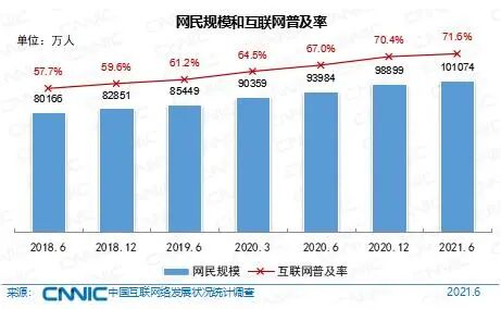 截至2021年6月,我国网民规模为10.11亿,互联网普及率达71.6%。互联网应用和服务的广泛渗透构建起数字社会的新形态:短视频、直播正在成为全民新的生活方式;人们的购物方式、餐饮方式发生了明显变化;在线公共服务进一步便利民众。(来源:新浪科技)