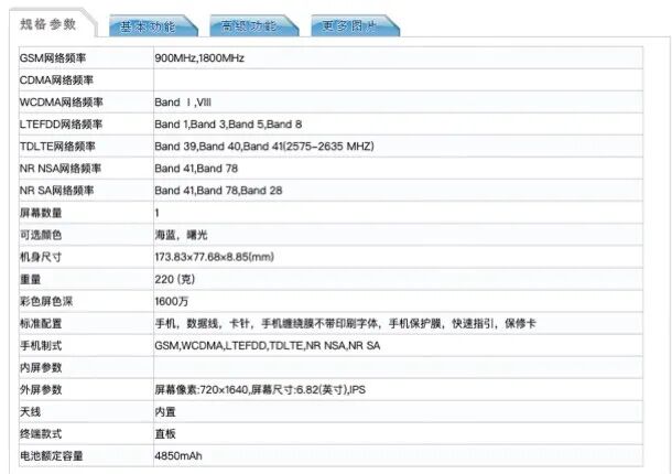 从认证信息可以看出,该机搭载 720P IPS 液晶屏,分辨率 720×1640,屏幕尺寸为 6.82 英寸。手机重 220g,电池容量 4850mAh,搭载 Android 11 系统。内存可选 4GB、6GB、8GB ,存储空间大小覆盖 64GB 至 512GB,实际上市的容量大小则未知。