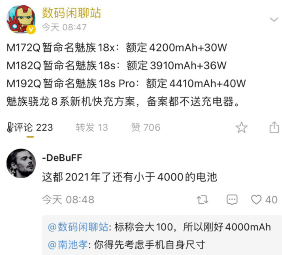 该博主称,魅族 18x、18s、18s Pro 三款新机,分别对应 M172Q、M182Q 和 M192Q,新机的电池容量和快充信息分别为 4200mAh+30W、3910mAh+36W 和 4410mAh+40W。他还称,上述魅族骁龙 8 系新机都不送充电器。