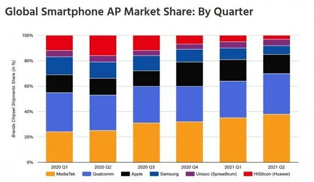 报告显示 2021 年第 2 季度,苹果在智能手机芯片组类别中拥有 15% 的市场份额。与去年同期 13% 的份额相比,苹果的市场份额实际上略有增加。而同期三星的市场份额只有 7%。(来源:新浪科技)