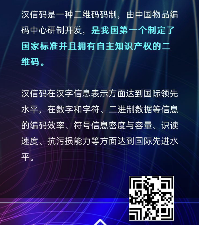 汉信码由中国物品编码中心牵头自主研制,是拥有完全自主知识产权的二维码码制,具有知识产权免费、支持任意语言编码、汉字信息编码能力超强、极强抗污损、抗畸变识读能力、识读速度快、信息密度高、信息容量大、纠错能力强等突出特点,达到国际领先水平。(来源:IT之家)