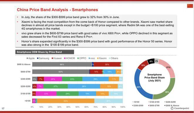 近日,来自第三方调研机构 Counterpoint 的数据显示,今年 7 月份 vivo 继续领跑国内智能手机市场,占据 24% 的市场份额。紧随其后的是 OPPO 和小米,其中荣耀的进步也颇大,排到国内第四,市场份额达到了 13%,比苹果还多一个百分点(苹果 12%)。