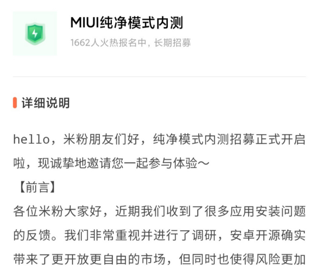 近日有消息称,小米手机 MIUI 纯净模式内测长期招募,纯净模式内测招募正式开启。