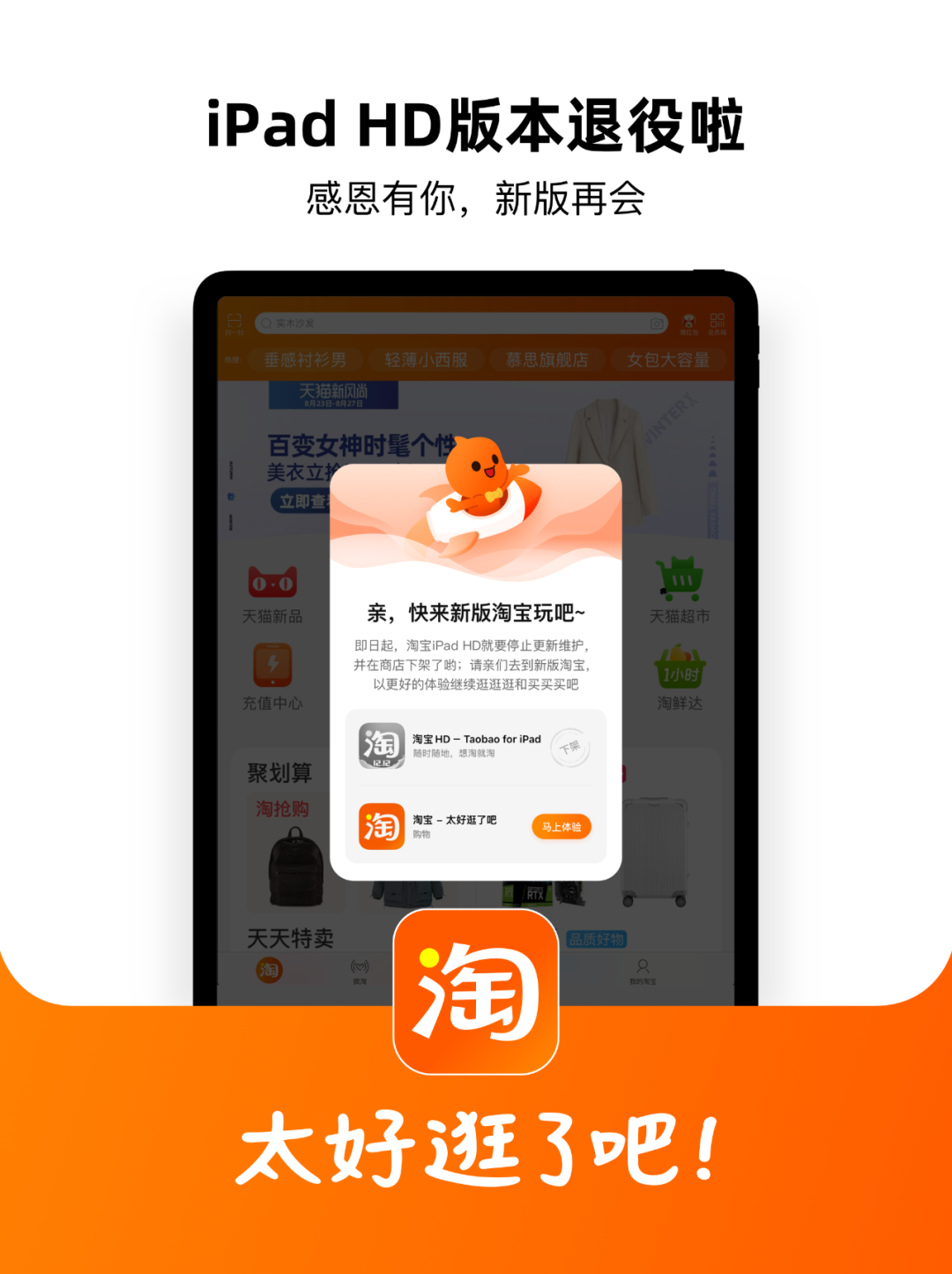 并且宣布淘宝 iPad HD 版本退役,停止技术支持和维护,将其从苹果 App Store 中下架。用户需要下载新版淘宝。