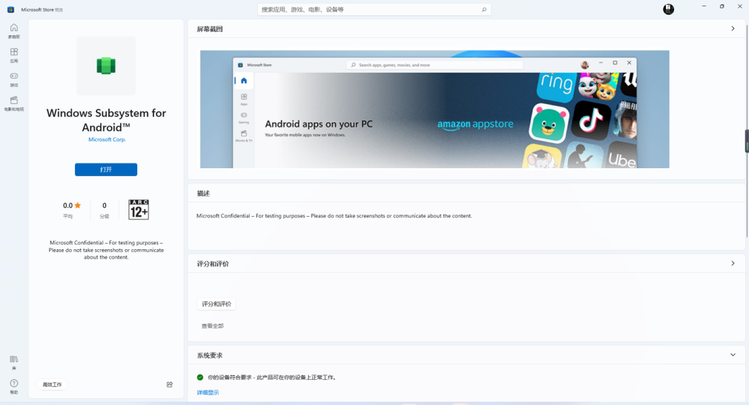 不过,目前打开微软商店提供的 Windows 安卓子系统应用程序,只能看到一个空白的窗口。该列表在介绍中只说这是微软的机密,该应用是用于测试的,使用它的人不应该截图或谈论其内容。