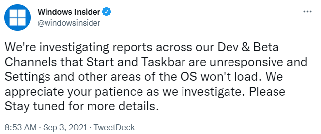 对此,Windows Insider 表示,将调查 Dev 和 Beta 频道的问题,包括开始菜单和任务栏没有响应,操作系统的设置和其他区域无法加载等情况。