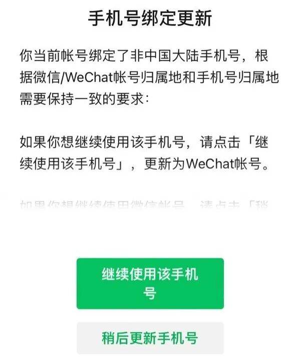近日有网友表示,微信如果绑定的是非中国大陆手机号,目前可收到“换绑手机号”或者“迁移到 WeChat ”的要求。
