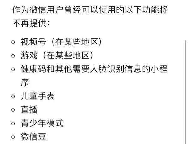此外,提示页面还指出,在符合适用法律的前提下,用户的数据会在 10 个工作日内迁移到 WeChat 服务器。并且将不再提供以下原本可用的功能: