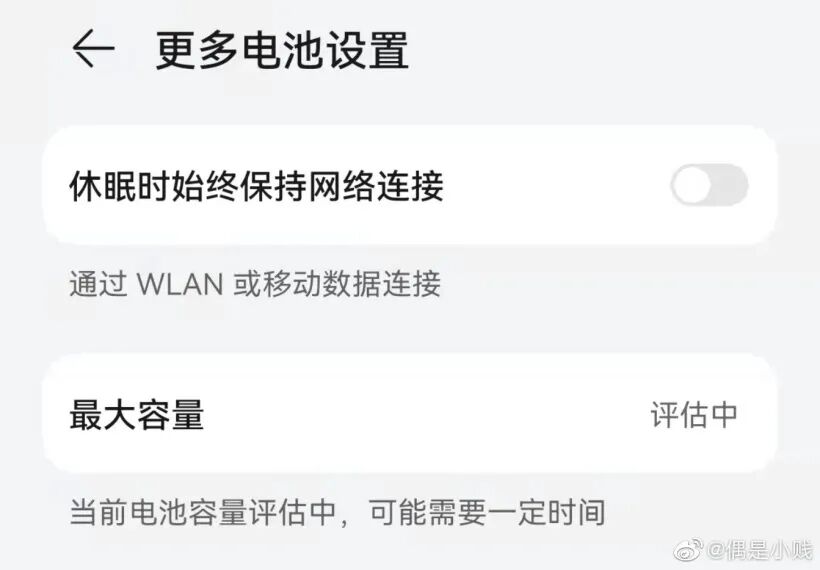 从发布的图中可以看到,在电池设置选项中出现了一项“最大容量”,系统可评估设备的当前电池容量,从而让用户了解设备的电池健康度。