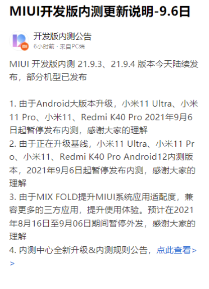 昨天,MIUI 官方宣布:由于 Android 大版本升级,小米 11 Ultra、小米 11 Pro、小米 11、Redmi K40 Pro 等自 2021 年 9 月 6 日起暂停发布内测。
