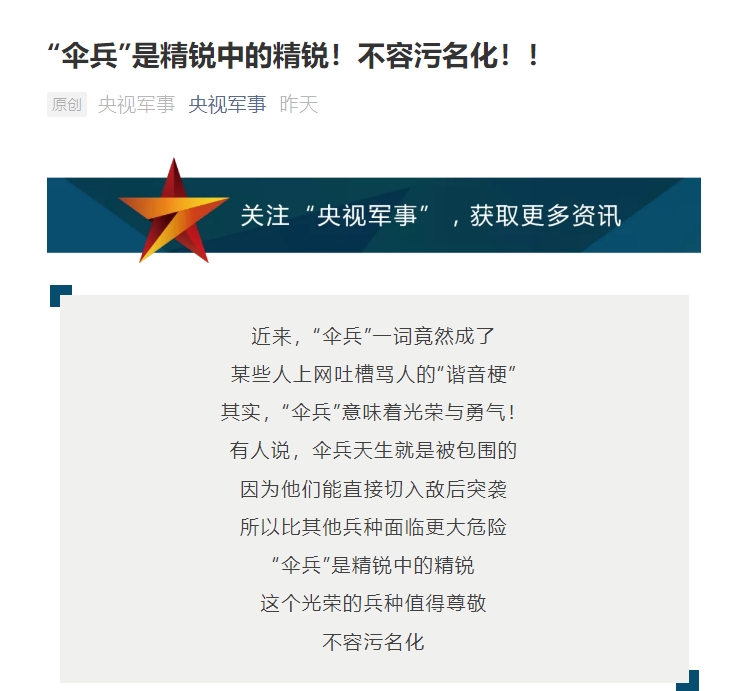 据了解,官方媒体近日发文称,近来,“伞兵”一词竟然成了某些人上网吐槽骂人的“谐音梗”,“伞兵”是精锐中的精锐,这个光荣的兵种值得尊敬,不容污名化。