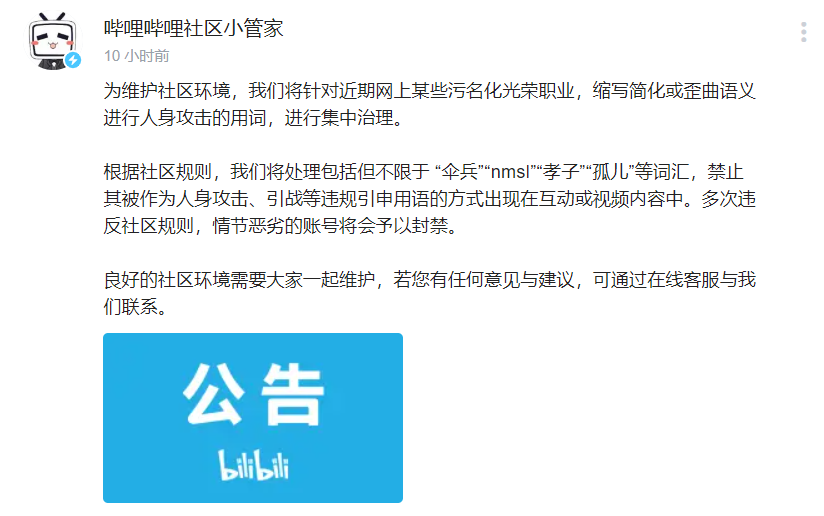 昨晚,B站哔哩哔哩社区小管家发布公告,为维护社区环境,将针对近期网上某些污名化光荣职业,缩写简化或歪曲语义进行人身攻击的用词,进行集中治理。