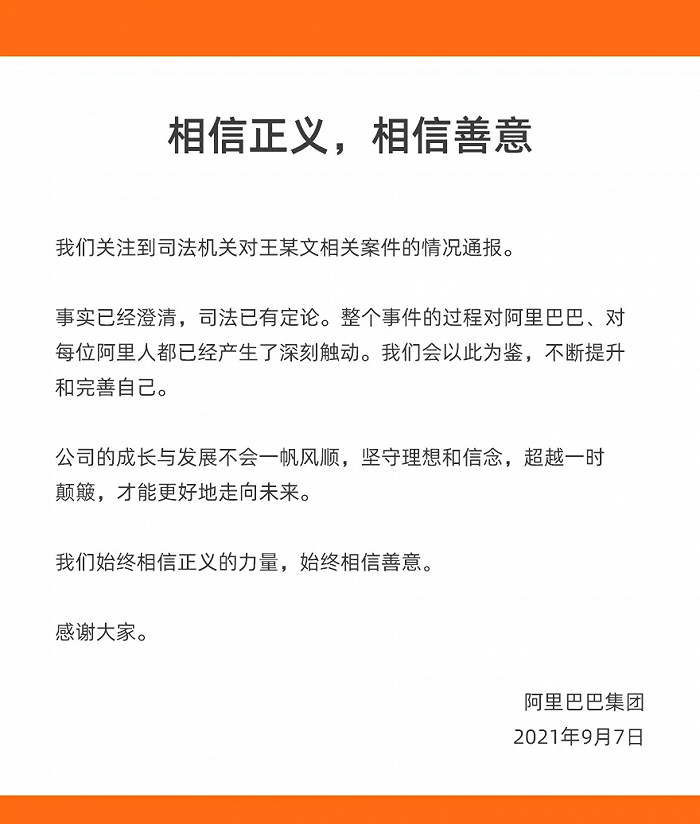 今天,阿里巴巴发文称,关注到司法机关对王某文相关案件的情况通报。