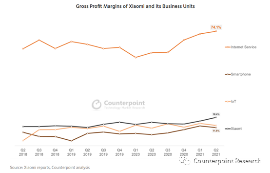 自 2018 年小米上市以来,其互联网服务在该公司季度收入中的占比不超过 10%,但互联网服务部门的季度毛利率平均为 65.12%。近日,市场研究机构 Counterpoint Research 的最新报告显示,小米公司平均 42.74% 的毛利润是由互联网服务贡献的。