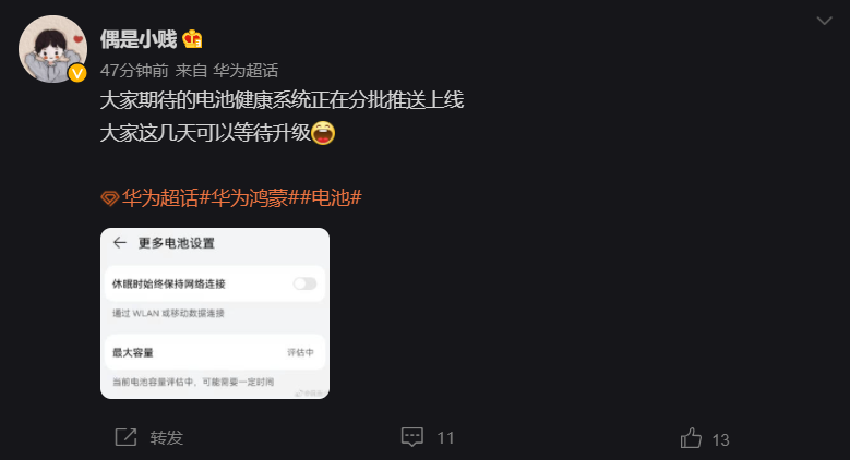 今天,据微博花粉超话主持人透露,华为鸿蒙 HarmonyOS 电池健康系统正在分批推送上线。