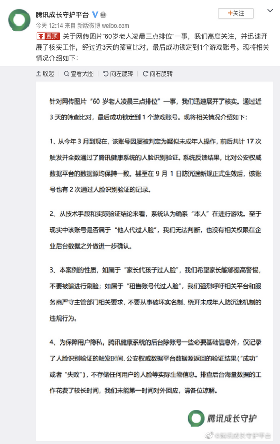 今日午间,腾讯成长守护平台微博发布公告就网传图片“60岁老人凌晨三点排位”一事作出回应。