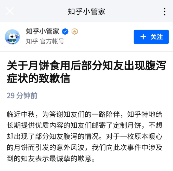 近日据部分知乎大 V 反馈,吃了知乎发的月饼会出现腹泻拉肚子现象。今天 #知乎月饼吃了拉肚子# 上了微博热搜。