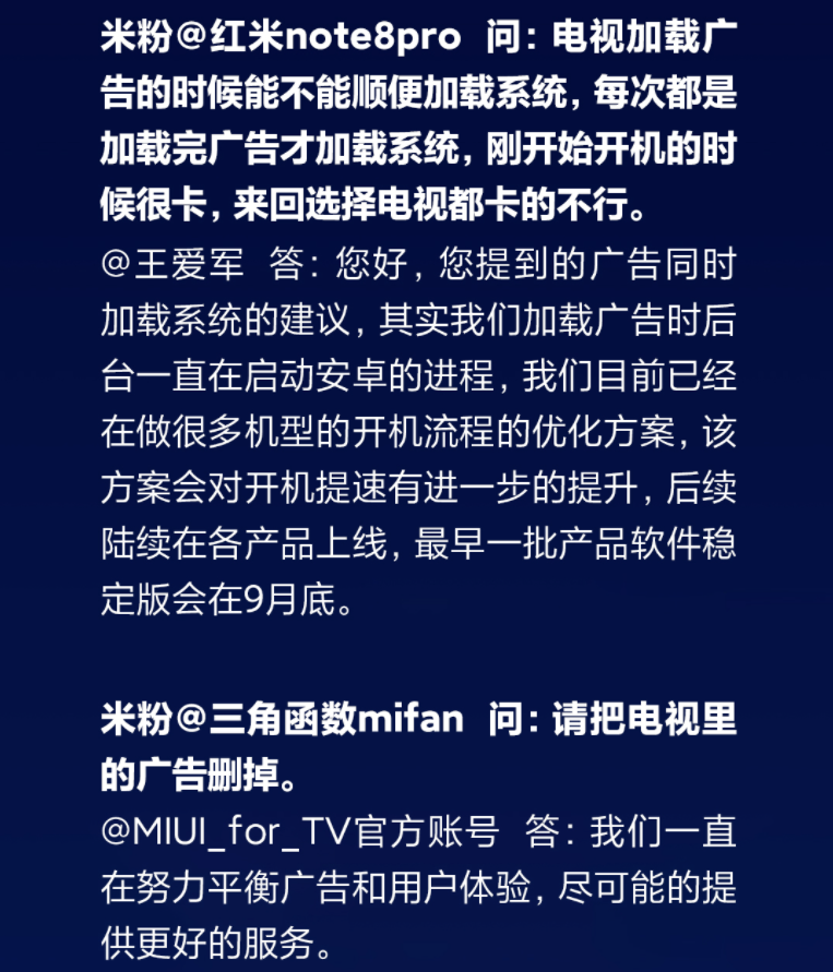 近日,有用户就电视广告一事询问小米官方人员,官方表示,他们一直在努力平衡广告和用户体验,尽可能的提供更好的服务。