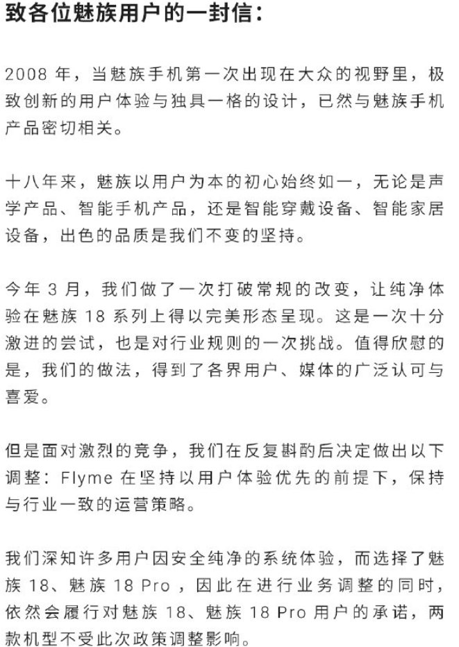 微博内容中称,魅族面对激烈竞争,在反复斟酌后决定做出以下调整:Flyme 在坚持以用户体验优先的前提下,保持与行业一致的运营策略。也就是说,原本魅族所尝试的「零广告、零推送、零预装」的三零手机策略将会在后续机型中取消。