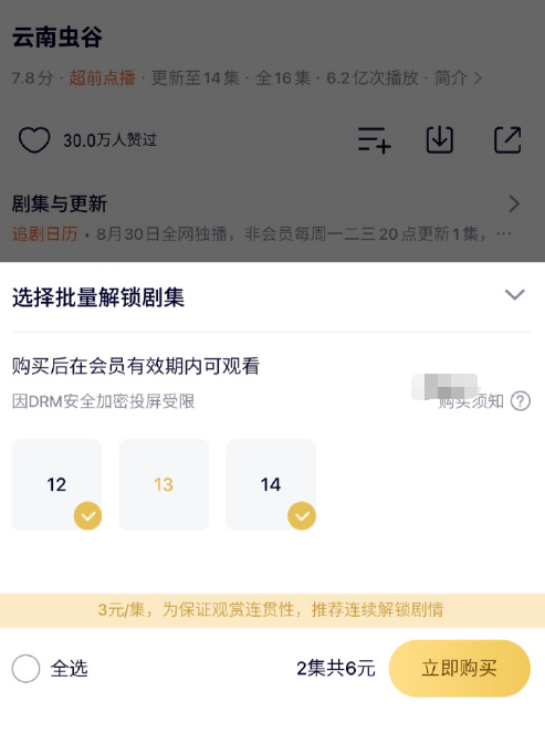 近日有网友发现,目前腾讯视频平台热播剧《云南虫谷》的超前点播已经可以选集解锁,同时保留了批量解锁多集的功能。目前该剧超前点播进度更新至 14 集,观众可以选择自由挑选,跳集解锁 12-14 集中的任意一集,也可以选择一次性解锁多集。