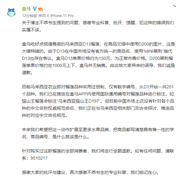 今天下午,盒马官方微博发文,对博主@不乖书生 昨日发博控诉其榴莲品种造假作出回应。盒马对此道歉,称其榴莲描述中图片与实物品种不对应,造成了误导。