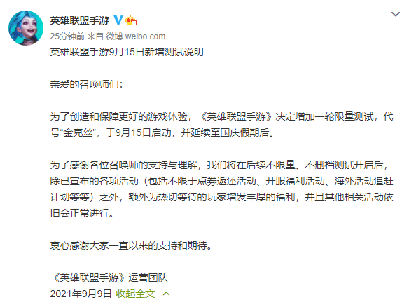 今天,《英雄联盟手游》又发布了一则新的测试说明:为了创造和保障更好的游戏体验,《英雄联盟手游》决定增加一轮限量测试,代号“金克丝”,于 9 月 15 日启动,并延续至国庆假期后。