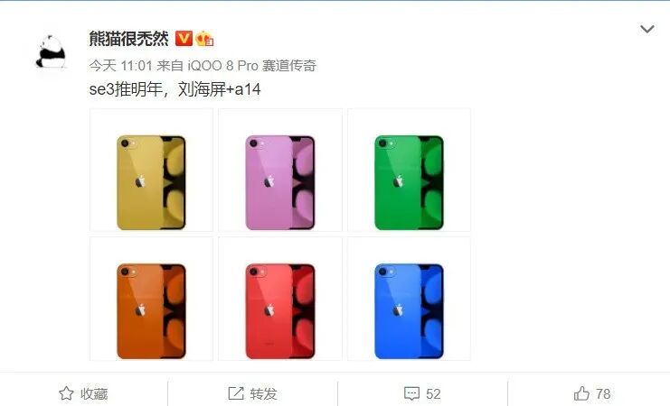 据微博博主 @熊猫很禿然称 iPhone SE 3 搭载刘海屏,采用 A14 芯片。不过该博主也表示,推出的时间越晚,越可能采用新的芯片。