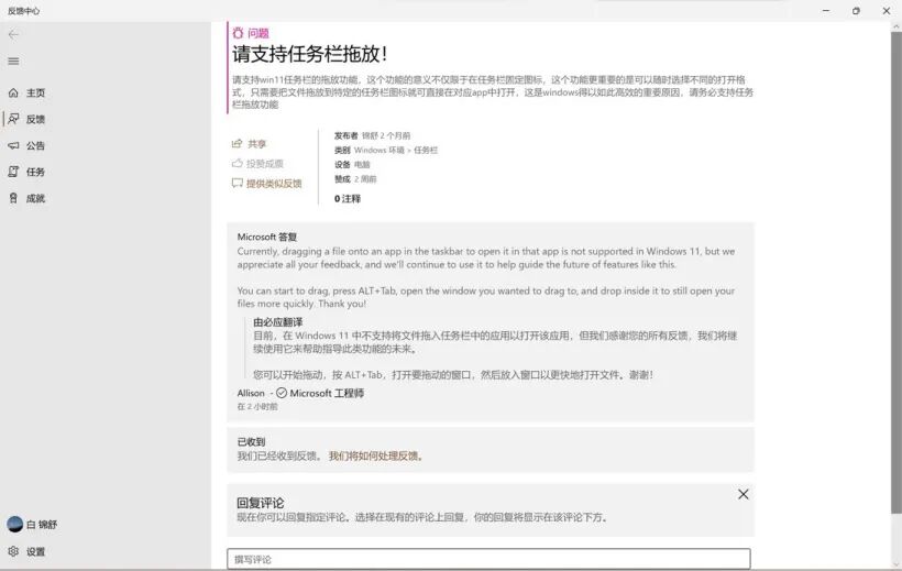 近日,微软在反馈中心更新了关于“任务栏拖放”被取消以后应该如何操作的说明。