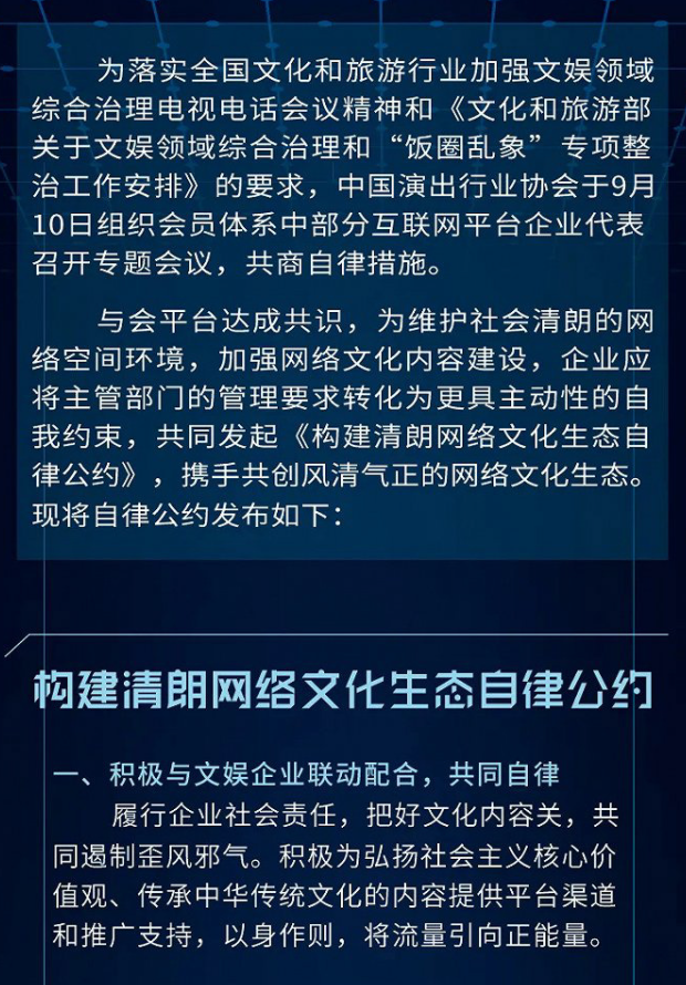 今日,中国演出行业协会联合微博、爱奇艺、腾讯视频、优酷、哔哩哔哩、咪咕视频、今日头条、抖音、快手、QQ 音乐、酷狗音乐、酷我音乐、咪咕音乐、小红书 14 家平台共同发布《构建清朗网络文化生态自律公约》。
