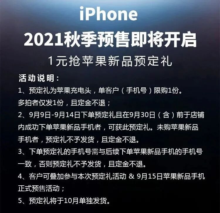 2、9 月 9 日-9 月 14 日下单预定礼且在 9 月 30 日(含)前于店铺内成功下单苹果新品手机者,可获此预定礼。未购苹果新品手机者,预定礼不予发货,且定金不退。