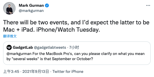 近日,根据外媒记者在 Twitter 上公布的信息,苹果今年下半年预计将举办两场发布会:第一场就是苹果已经官宣的“加州来电”特别活动,主角是 iPhone 13 和 Apple Watch Series 7;第二场的主角有可能是 Mac 和 iPad。