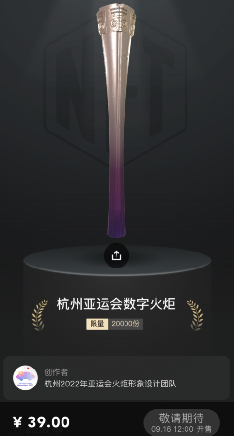 支付宝小程序“智能亚运一站通”显示,杭州亚运会数字火炬“薪火”将于 9 月 16 日 12 点开售,价格为 39 元,全球限量 2 万个。官方还提醒,数字火炬为 NFT 数字作品,仅限实名认证为年满 14 周岁的中国大陆用户购买,用户不得将 NFT 数字作品用于任何商业用途。(来源:IT之家)