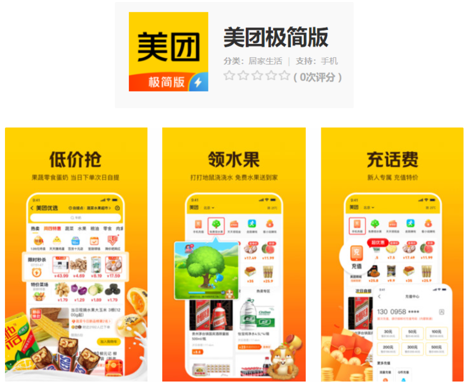 近日,美团极简版 App 上架安卓应用市场,对主应用的功能进行了删减,保留了美团主应用中涉及生活用品采购的相关业务。用户在打开极简版后,首页会呈现出采购蔬果、米面水油等生活用品的购买入口。