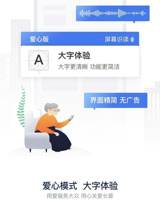 12306对照国家关于适老化无障碍功能指引,结合广大旅客需求制定了技术改造方案,对字体和排版进行了适配,使得爱心模式界面具有大字体、大图标、高对比度等特点。