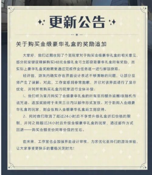 《哈利波特:魔法觉醒》手游官方微博发布公告称,近期收到了个别玩家对于购买金缎豪华礼盒的相关意见,部分玩家错误理解购买148元金缎礼盘可立即获取豪华礼盒所有奖励,而实际上豪华礼盒奖励需要通过完成作业任务逐一进行解锁获取。经评估,游戏内确实存在界面设计表述不够清晰的问题,让部分巫师产生了误解。