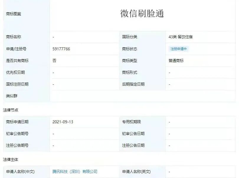 近日,腾讯科技(深圳)有限公司申请注册多个“微信支付刷脸通”“微信人脸通”“微信一脸通” 等相关商标,国际分类涉及餐饮住宿、设计研究等,当前商标状态均为申请中。