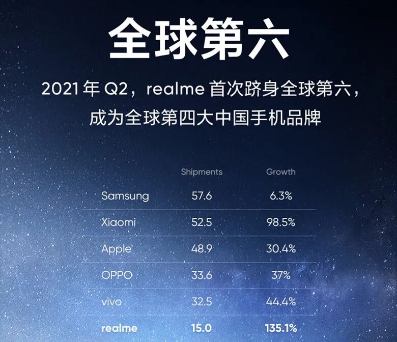 据调研机构 Counterpoint 统计,realme 真我 2021 年第二季度智能手机出货量为 1500 万,同比增长 135.1%,首次进入全球第六,成为全球第四大中国手机品牌。此外,realme 是全球最快达到 1 亿台销量的智能手机品牌。