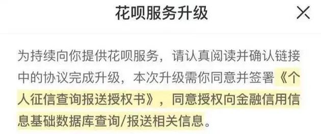 近日,有多位花呗用户反映,收到“花呗服务升级”提示,显示用户需签署《个人征信查询报送授权书》,同意授权向金融信用信息基础数据库查询/报送相关信息。