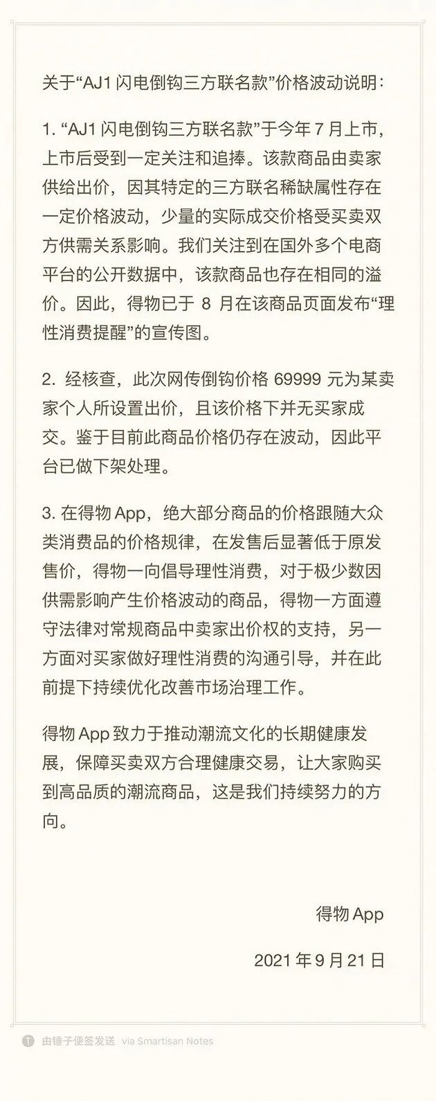 得物 App 发布《关于“AJ1 闪电倒钩三方联名款”价格波动说明》。得物表示,经核查,此次网传倒钩价格 69999 元为某卖家个人所设置出价,且该价格下并无买家成交。鉴于目前此商品价格仍存在波动,因此平台已做下架处理。