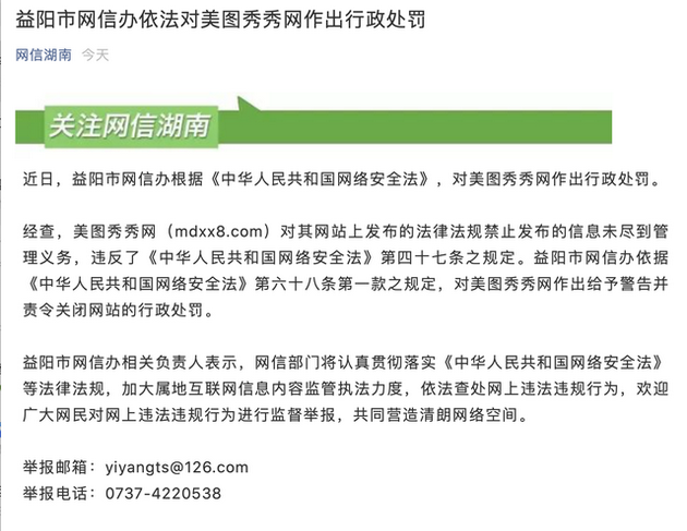 9月22日,“网信湖南”微信公众号发布一起行政处罚公告,涉及对象为“美图秀秀网”。处罚称,“美图秀秀网”(mdxx8.com)对其网站上发布的法律法规禁止发布的信息未尽到管理义务,违反了《中华人民共和国网络安全法》第四十七条之规定。