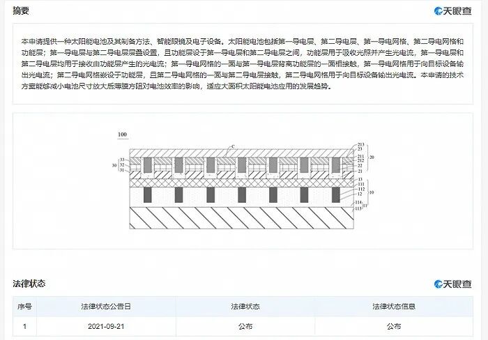 据天眼查APP显示,9月21日,华为技术有限公司公开“太阳能电池及其制备方法、智能眼镜及电子设备”专利,公开号CN113421977A,申请日期为2021年5月。