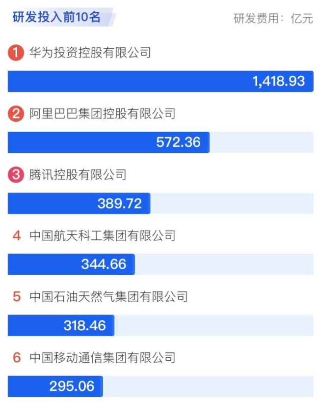 在研发投入排名中,华为以 1418.93 亿元的研发投入排名第一;阿里巴巴研发投入 572.36 亿元,排名第二;腾讯投入 389.72 亿元,位列第三。(来源:新浪科技)