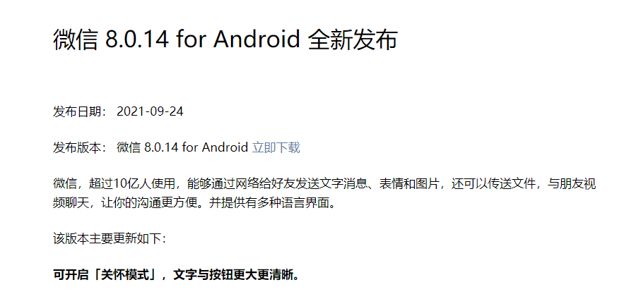 近日,安卓版的微信 8.0.14 正式版发布。根据微信官网的更新日志,该版本主要更新为:可开启「关怀模式」,文字与按钮更大更清晰。