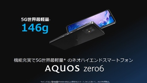 AQUOS zero6 再次回归轻薄设计,采用了骁龙 750G 5G CPU,6.4 英寸 OLED 面板,支持 240Hz 的刷新率,并支持毫米波 5G。其最大亮点是世界上最轻的 5G 手机,重量仅为 146 克,厚度为 7.9 毫米。